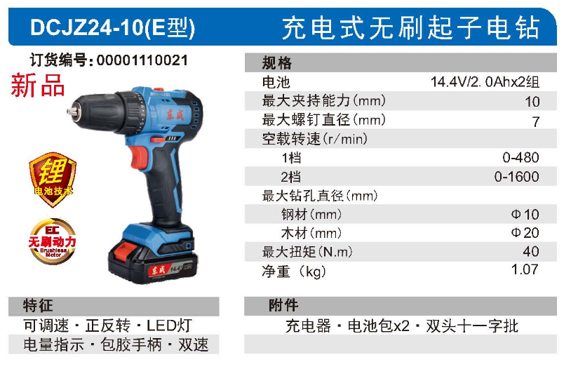 » 东成充电式无刷起子电钻DCJZ24-10(E型)